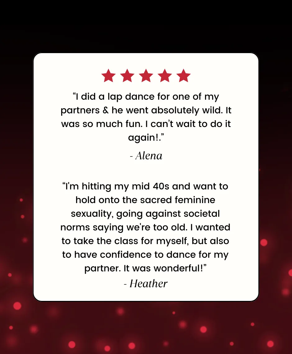 As a professional exotic dancer and feminine embodiment coach, I love to help women connect with their sensual energy and learn the art of seduction so they can build femme fatale confidence inside and outside of the bedroom.